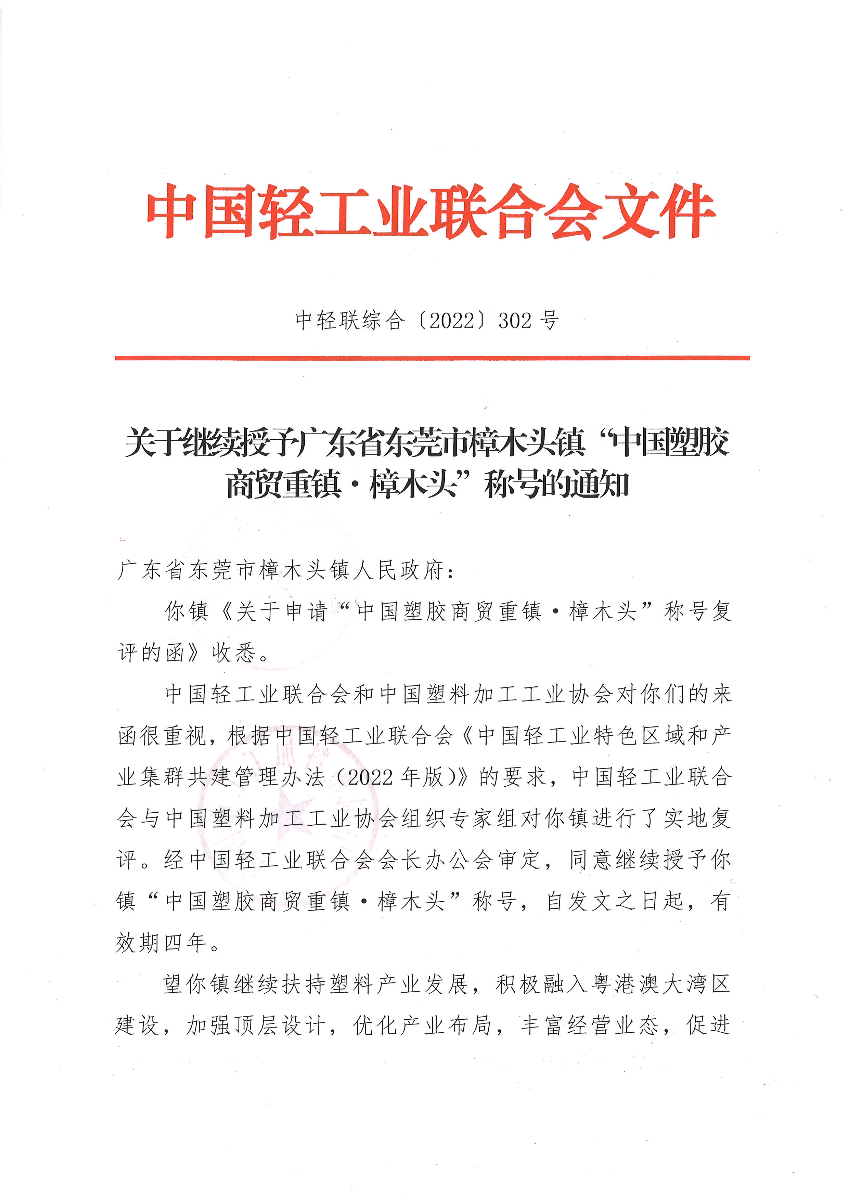 关于继续授予广东省东莞市樟木头镇“中国塑胶商贸重镇·樟木头”称号的通知