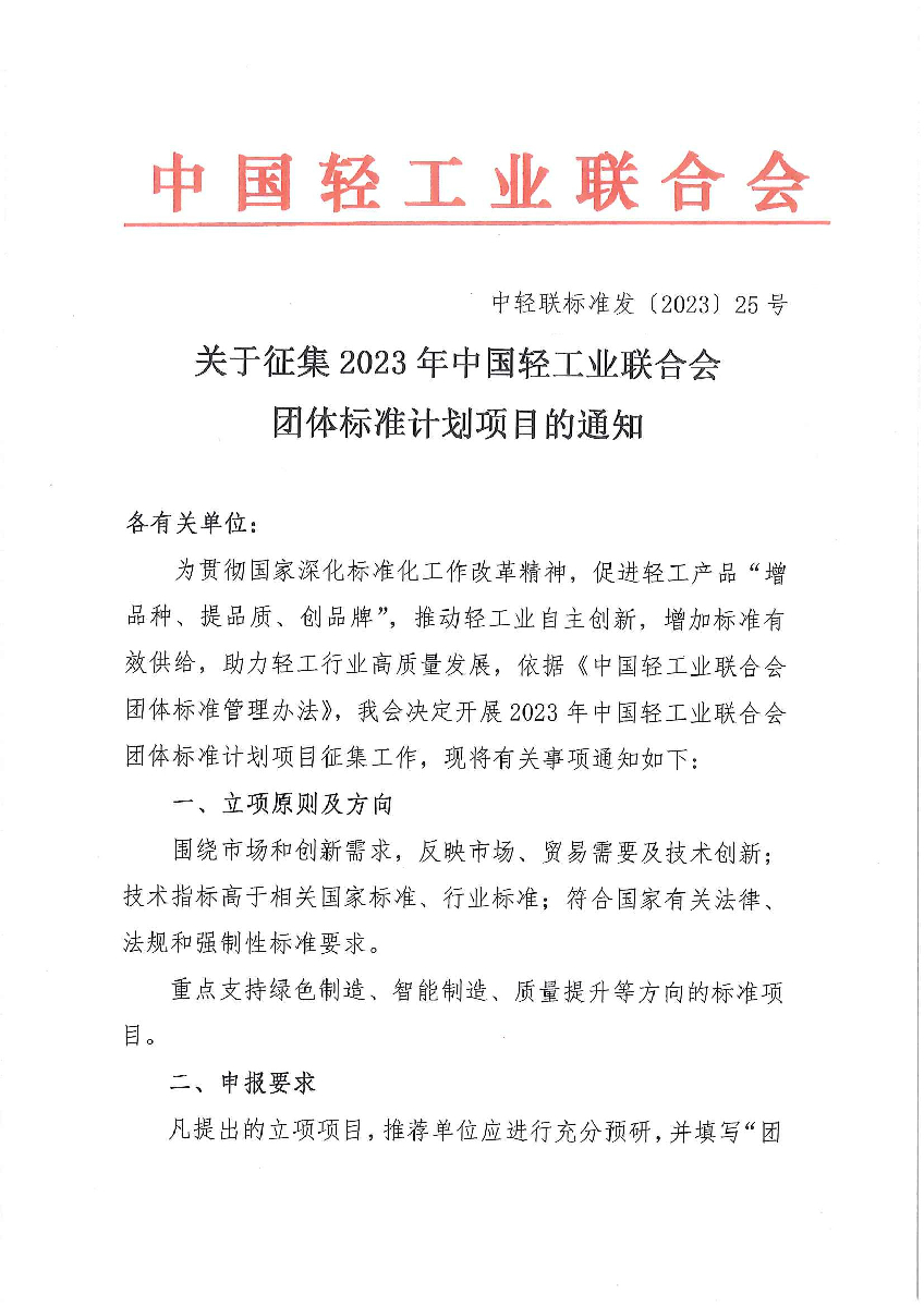 关于征集2023年糖心视频业联合会团体标准计划项目的通知