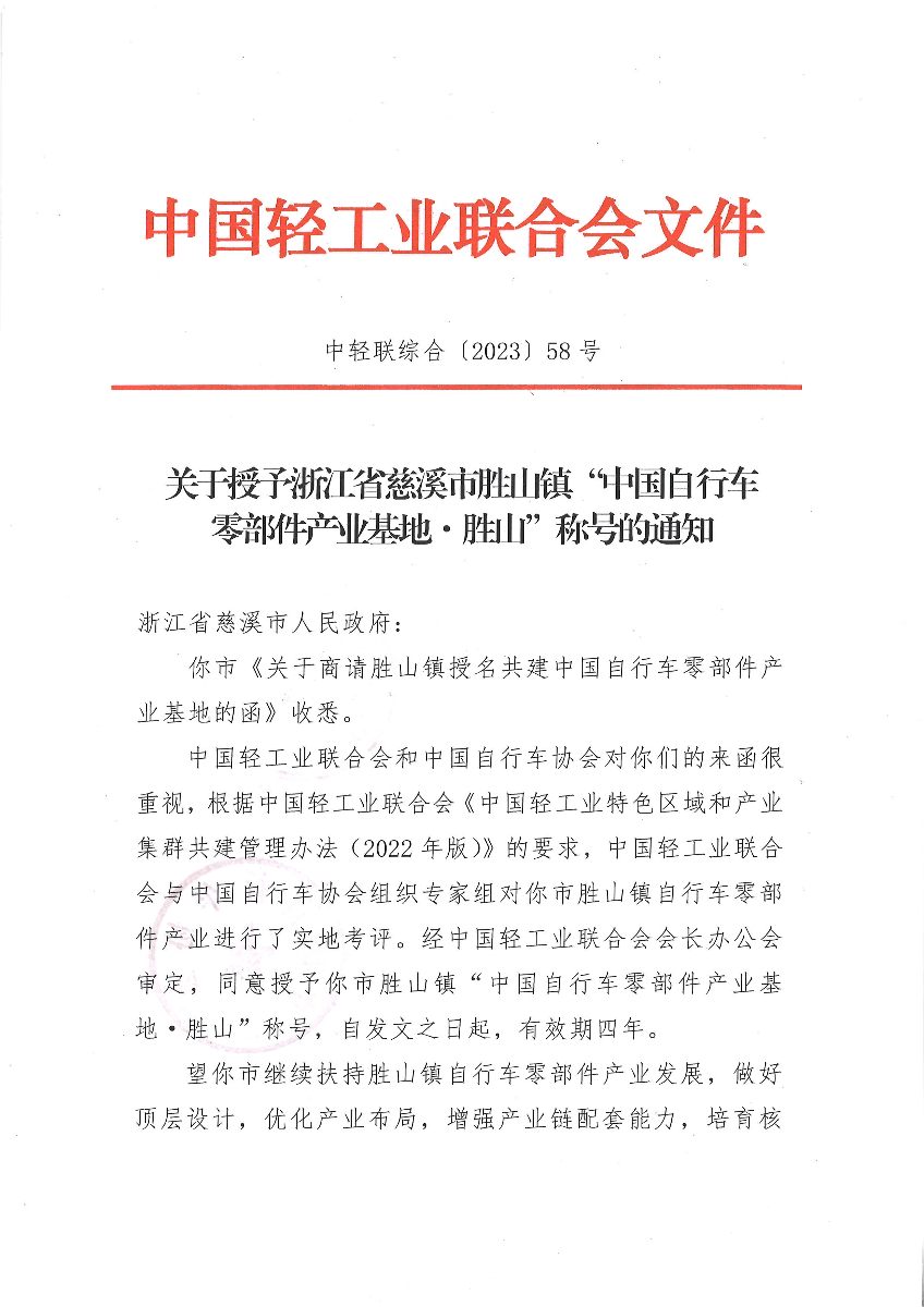 关于授予浙江省慈溪市胜山镇“中国自行车零部件产业基地·胜山”称号的通知