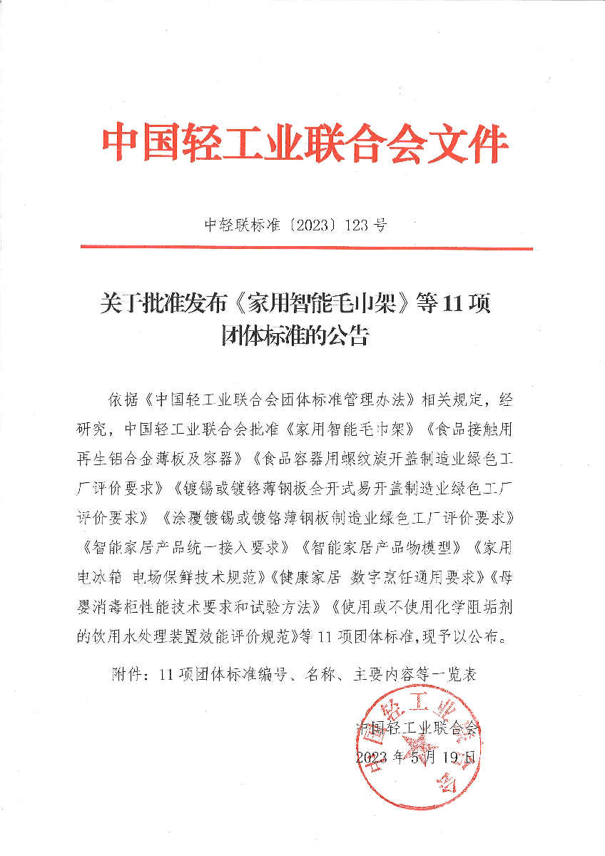 "糖心视频网站" 关于批准发布《家用智能毛巾架》等11项团体标准的公告