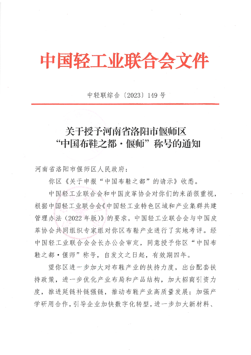 关于授予河南省洛阳市偃师区“中国布鞋之都·偃师”称号的通知