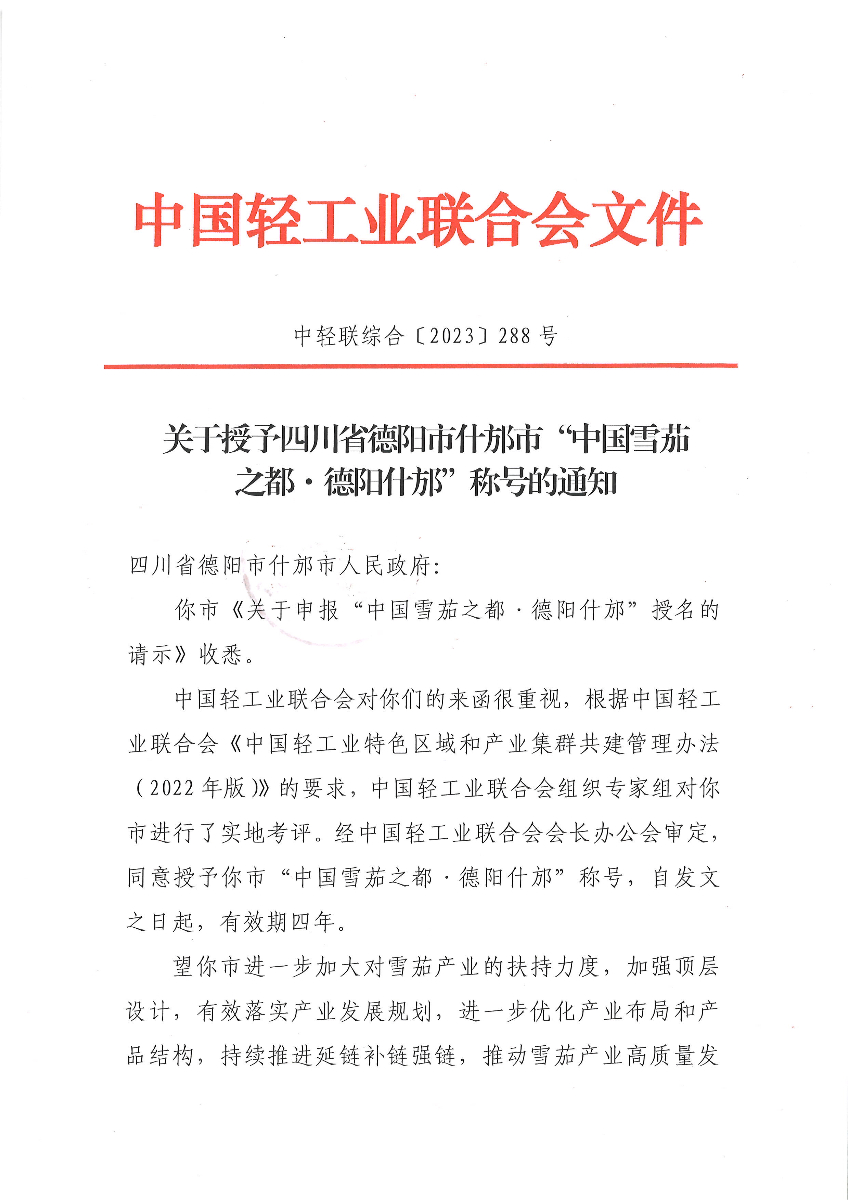 关于授予四川省德阳市什邡市“中国雪茄之都·德阳什邡”称号的通知