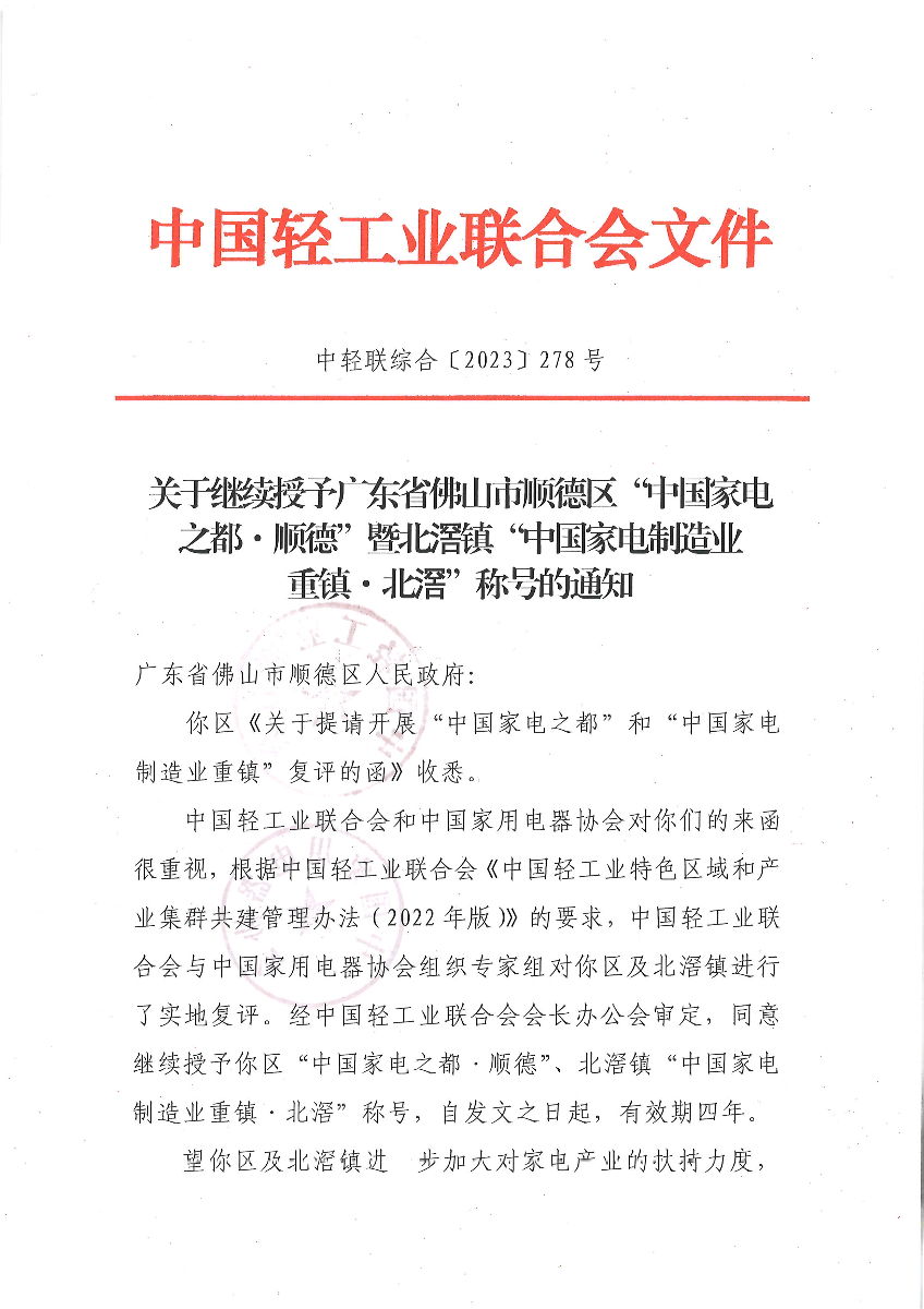 关于继续授予广东省佛山市顺德区“中国家电之都·顺德”暨北滘镇“中国家电制造业重镇·北滘”称号的通知