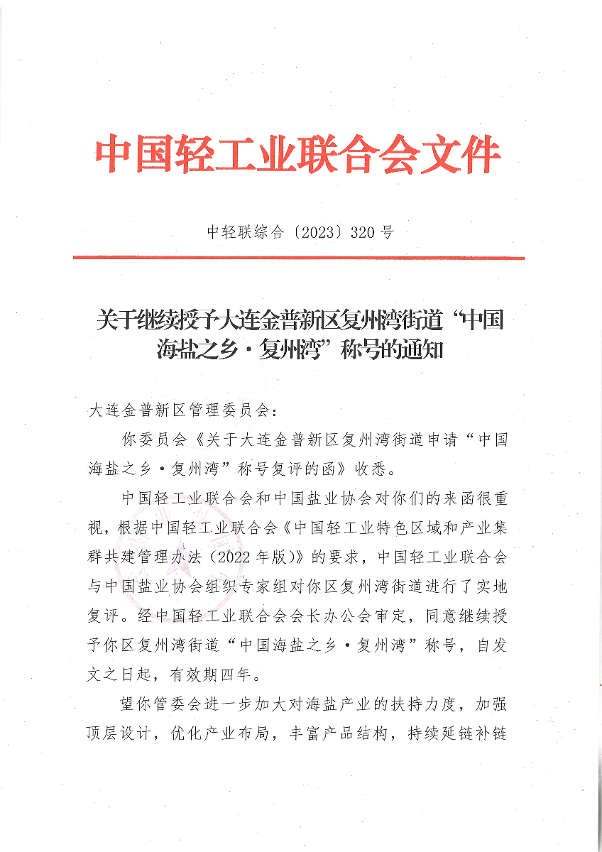 关于继续授予大连金普新区复州湾街道“中国海盐之乡·复洲湾”称号的通知