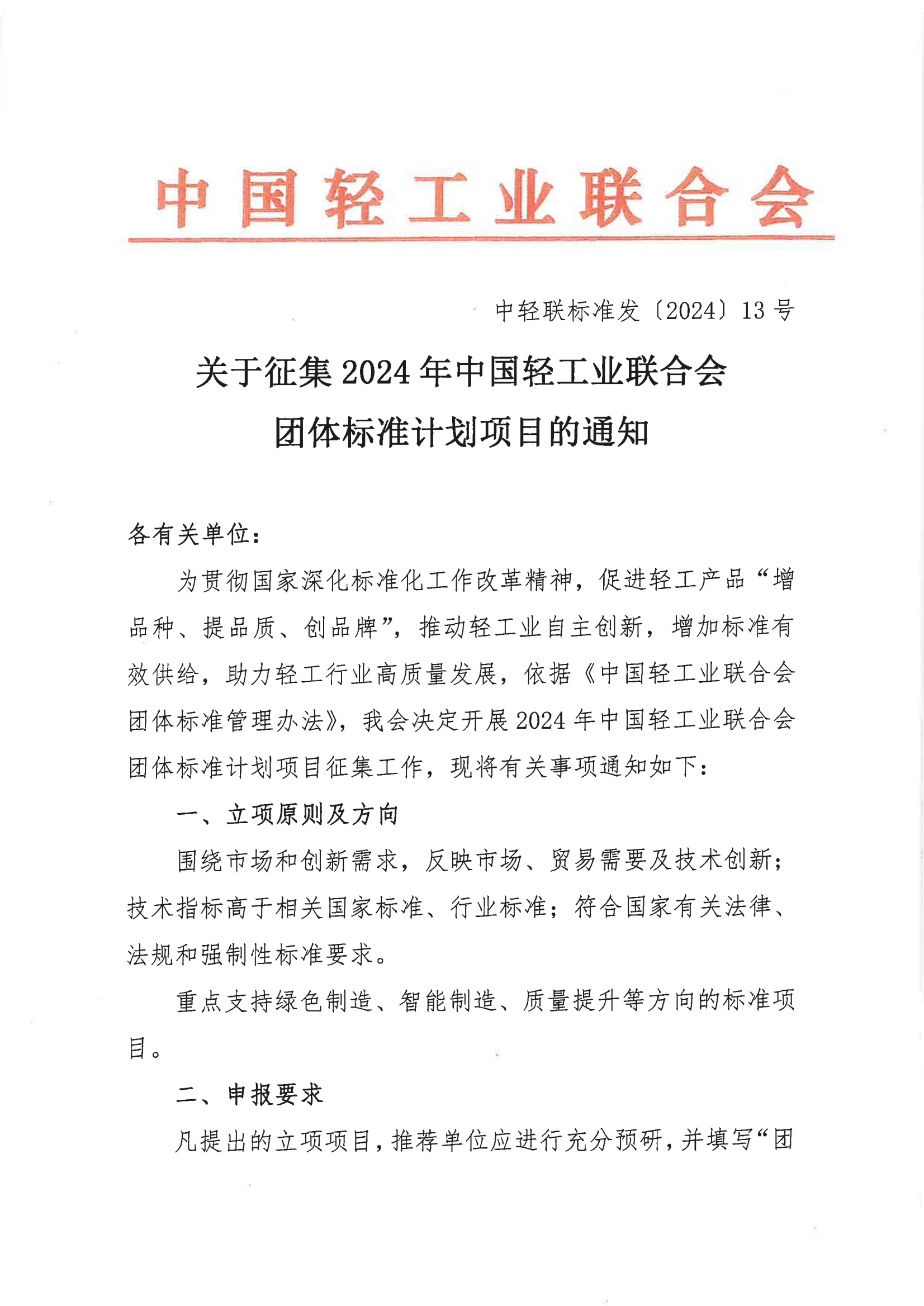 关于征集2024年糖心视频业联合会团体标准计划项目的通知