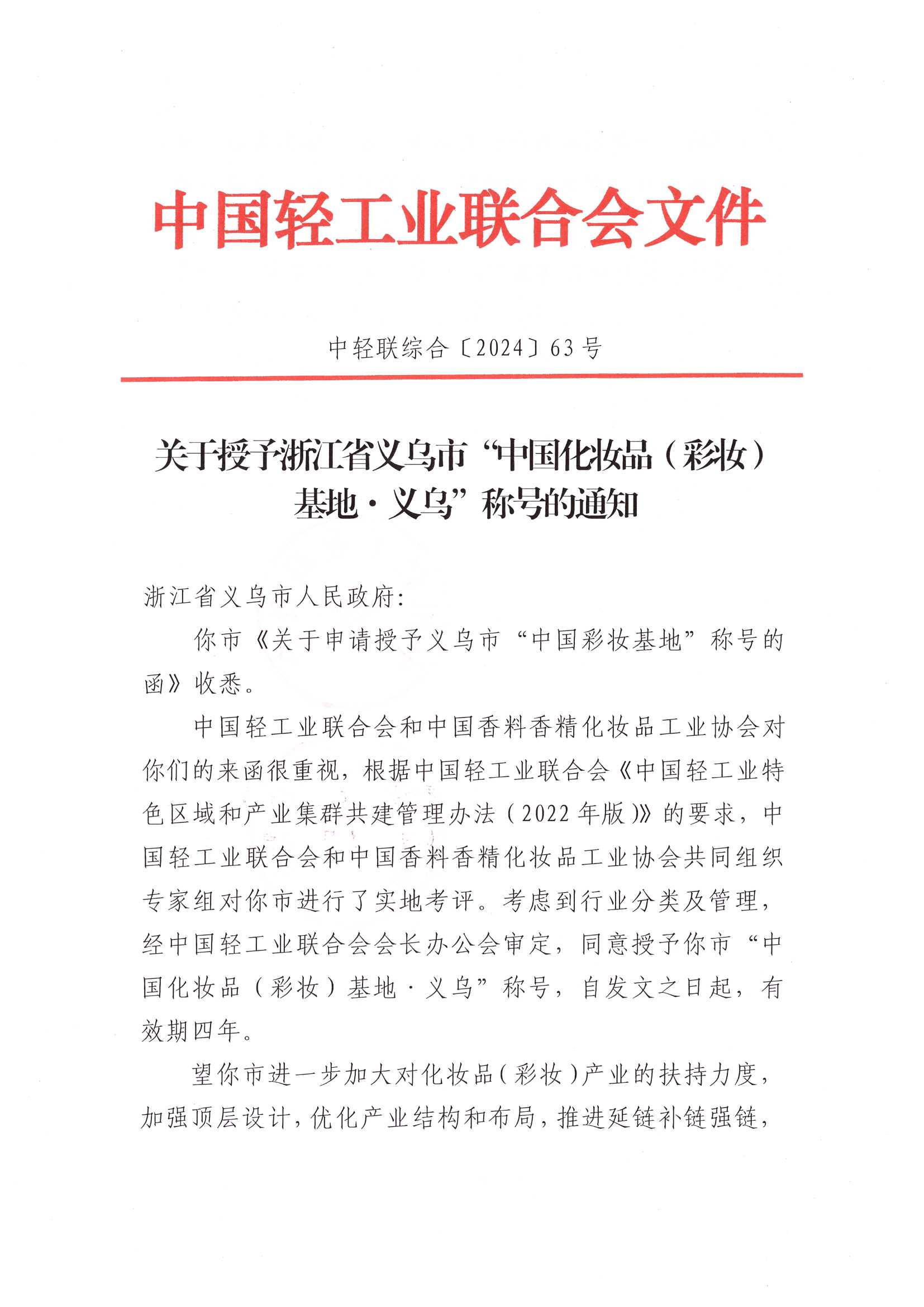 "糖心视频" 关于授予浙江省义乌市“中国化妆品(彩妆)基地·义乌”称号的通知