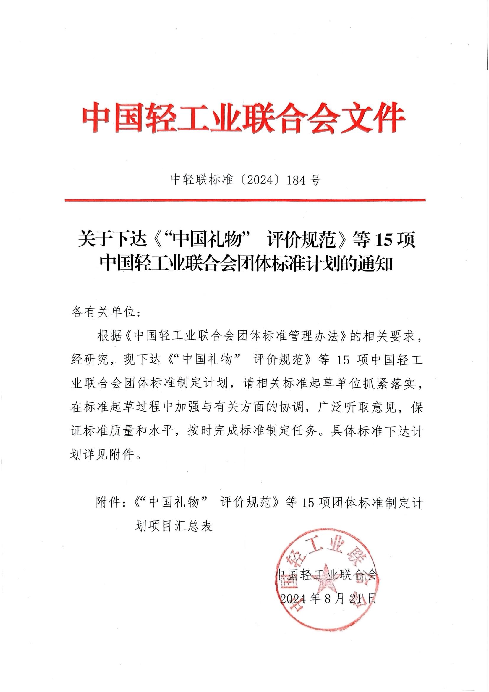 关于下达《“中国礼物”评价规范》等15项糖心视频业联合会团体标准计划的通知