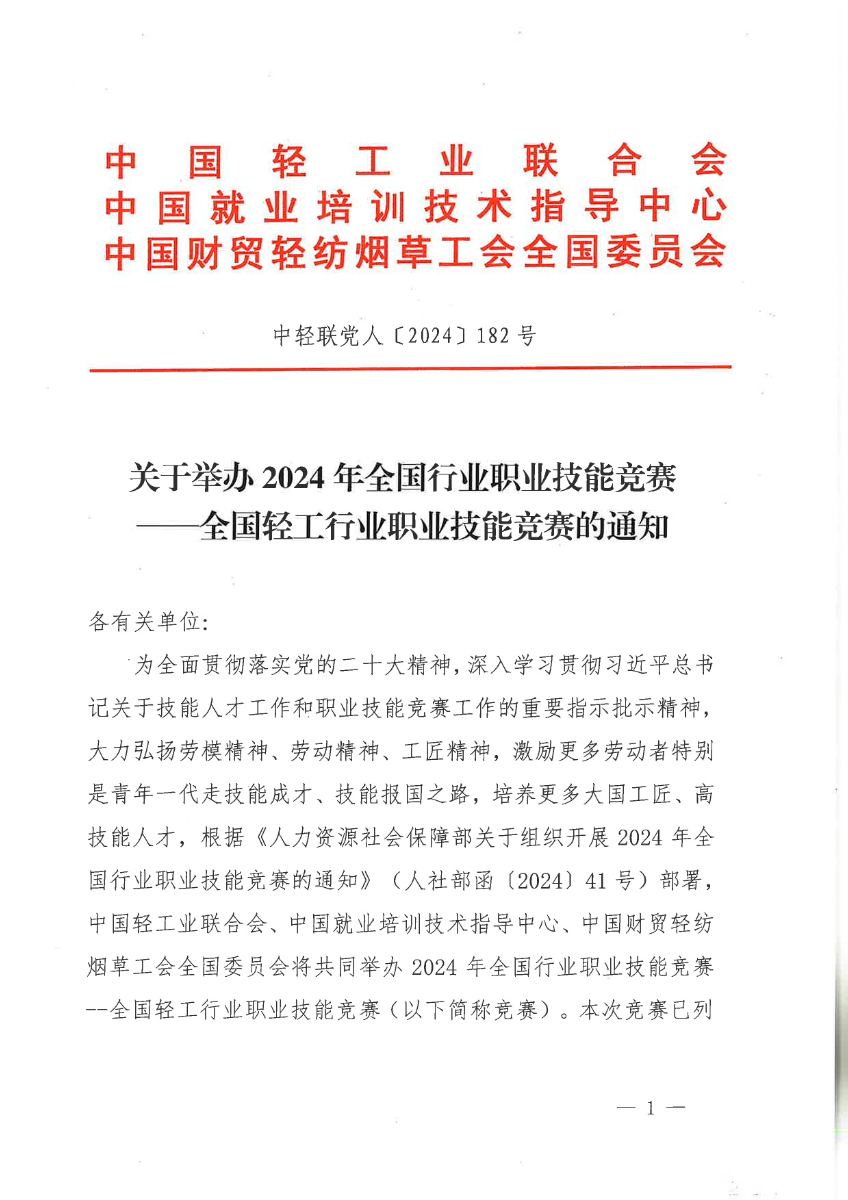 2024. 08. 15 中轻联党人〔2024〕182号 关于举办2024年全国轻工行业职业技能竞赛的通知