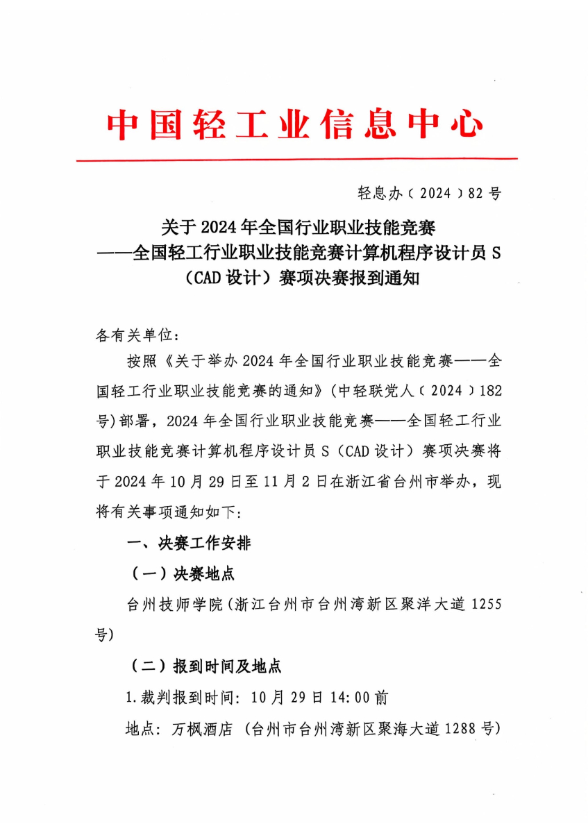 关于2024年全国轻工行业职业技能竞赛计算机程序设计员(CAD设计)赛项决赛报到通知
