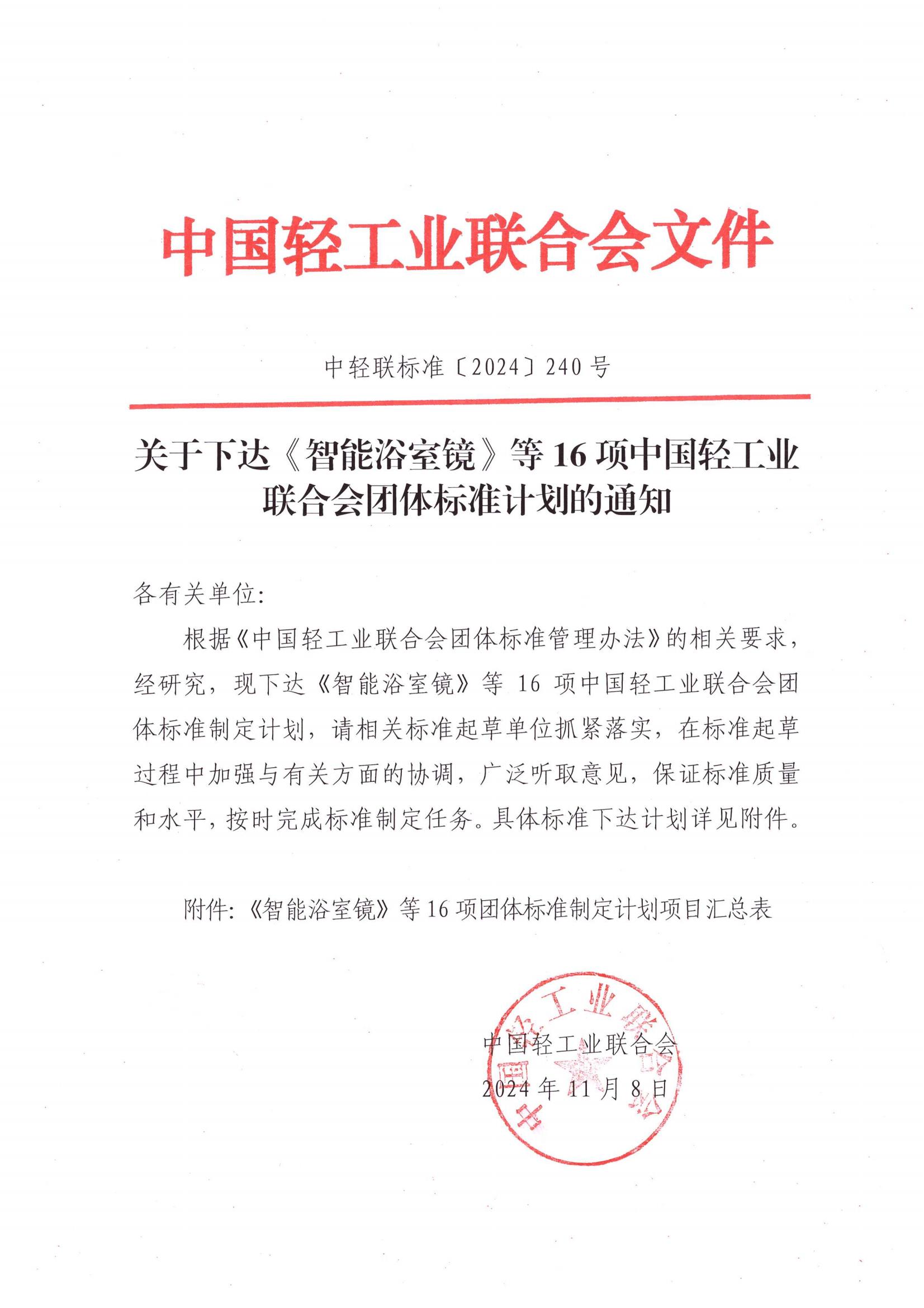 关于下达《智能浴室镜》等16项糖心视频业联合会团体标准计划的通知